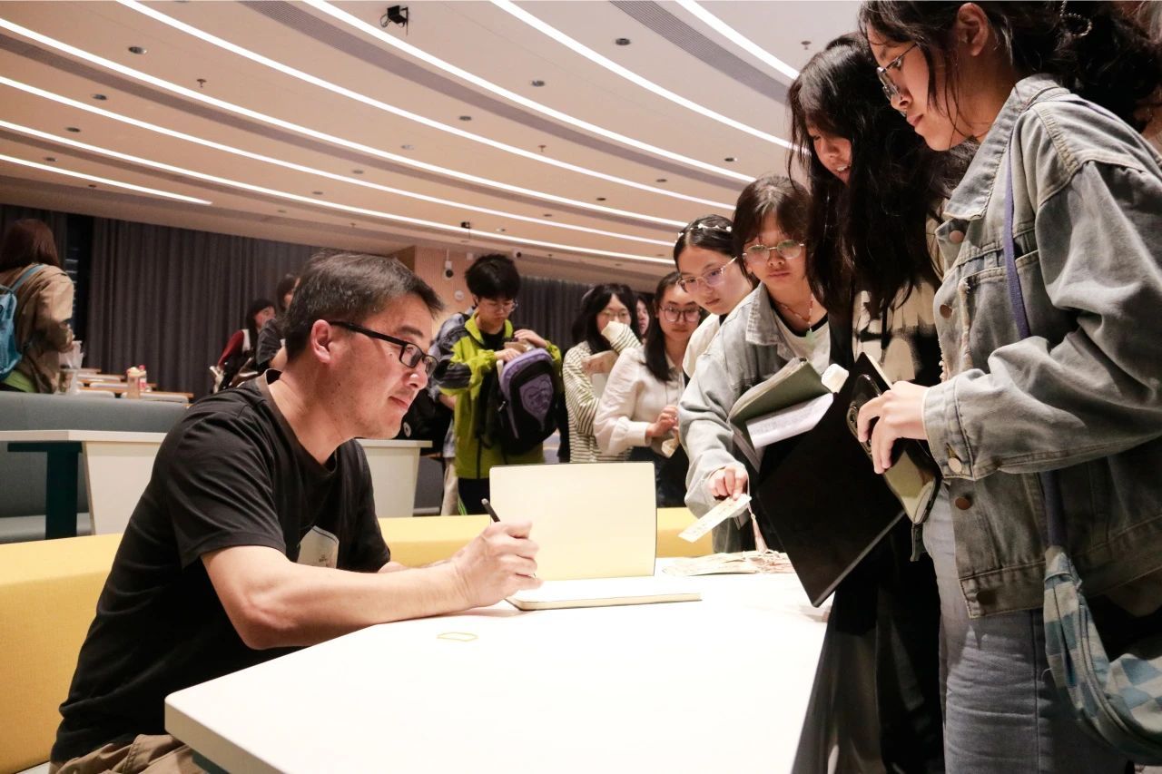 讲座氛围轻松自然,导演的分享有趣有料。2023级国际新闻与传播专业的陈思羽同学听完讲座后分享道:“海老师分享的幕后故事和拍摄过程,让我对纪录片拍摄有了新的认识。”讲座结束后,同学们纷纷上前找海金星互动交流、签名合影,留作纪念。