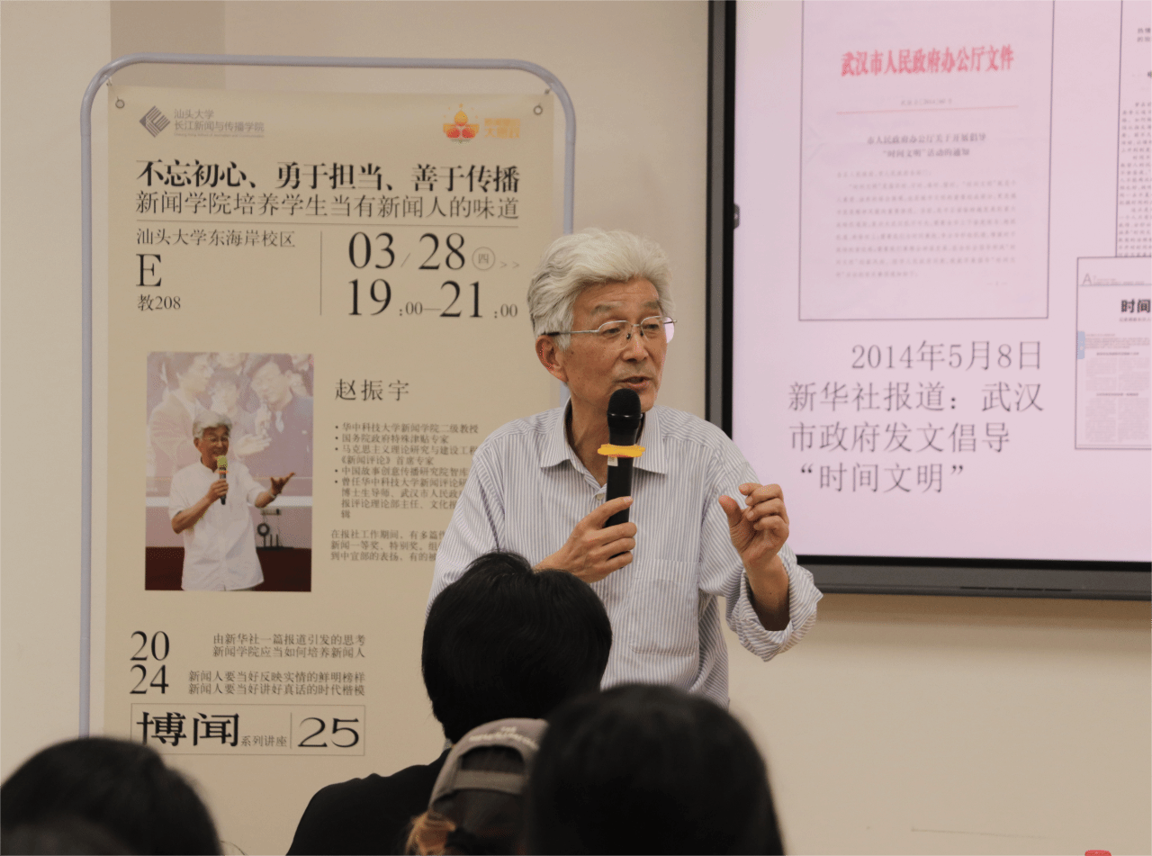 3月28日晚,华中科技大学新闻学院二级教授、马工程重点教材《新闻评论》首席专家赵振宇受邀在汕头大学东海岸校区开展一场主题为《不忘初心 勇于担当 善于传播—— 新闻学院培养学生当有新闻人的味道》的学术讲座。
