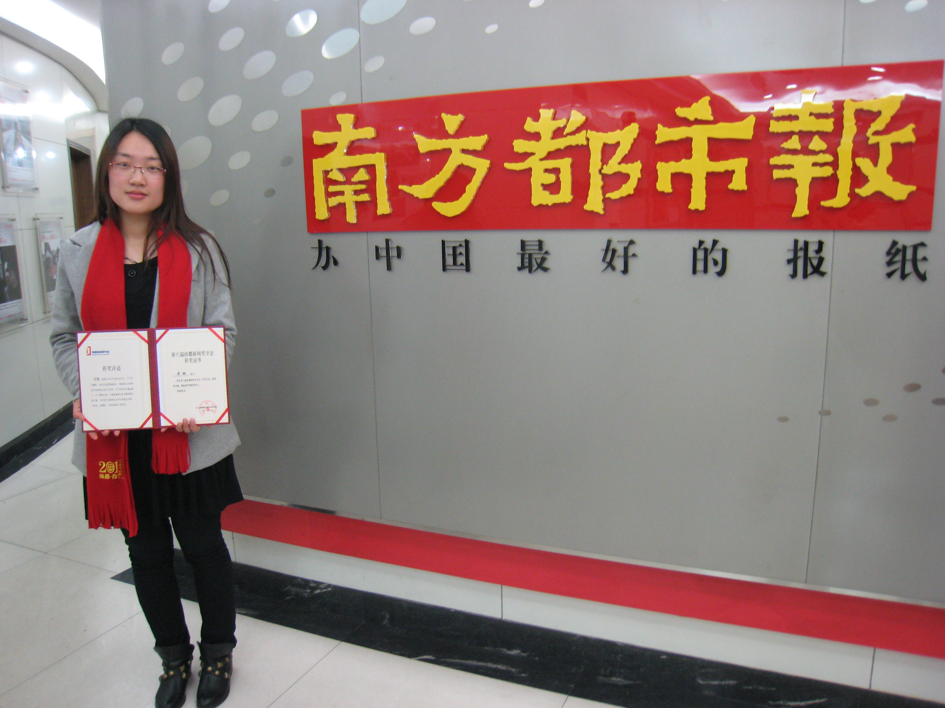 我于去年11月申请南都新闻奖学金。早在之前,南都的职业信条和品牌形象就已经在我心中驻扎,从学院获知奖学金接受申报的消息后,抱着一试的心情整理了相关资料进行申报。申报过程中,老师们给了我莫大的帮助,范东升院长对我的申报材料提出了修改意见,作为推委之一的陈婉莹院长更是对申请者的材料进行了审核和推荐,正是由于老师们辛勤无私的帮助,我的申报才得以顺利通过。