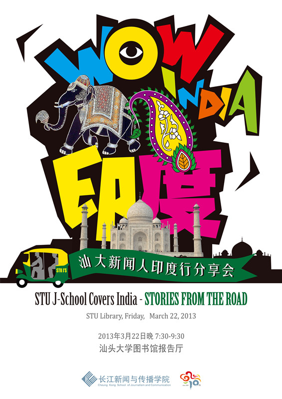 2013年1月23日至2月6日,汕头大学长江新闻与传播学院师生8人前往印度采访报道,近距离观察“不可思议”的印度,他们将在分享会上介绍他们的采访报道经历和体会。