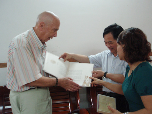 (广雅中学校长黄永光(中)给Peter Herford教授赠送该校纪念图册。)