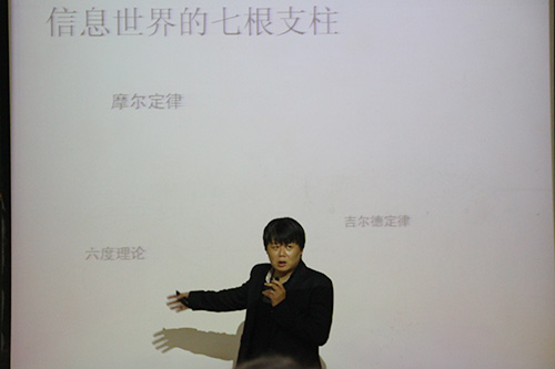 魏武挥老师有着丰富的行业实务经验和理论研究水平。第一场讲座一开场,他便引用学界中的媒介融合3C图及评估技术变革影响框架,向在座的学生描述出了一个数媒时代:在人类最伟大的发明互联网诞生后,记者面临更少的工作岗位,知识产权更难以界定,中层全部洗牌重新定义角色组织,隐私的丧失。紧接着,他介绍了摩尔定律、马太效应、六度理论、吉尔德定律、梅特卡夫原则与里德定律、幂计算这七根信息世界的支柱,并用丰富的数据、图表、实例阐释了数字媒体产业是怎样围绕这七个理论框架运作。魏武挥老师还特意向同学们推荐了戴维・温伯格的《数字秩序的革命》一书,帮助同学们更好理解数媒时代各个要素的运作。