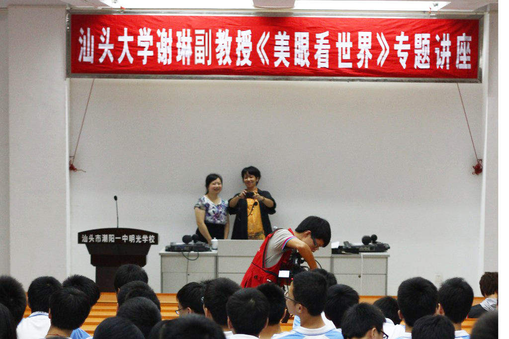 “只要用心去感受,用镜头去探索大千世界,那么留给你的影像,将是一种无比的乐趣,是一笔无穷的财富。”这句话是我院副教授谢琳5月16日在汕头市潮阳一中明光学校举行讲座“美眼看世界”时与现场的高中生们分享的最深感受。