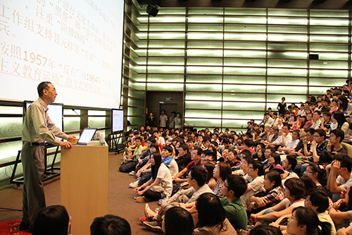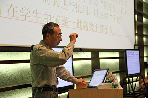 讲座中,印教授用沉稳的语调向观众讲述了文革的三次发动,以及相伴随的红卫兵运动。从1966年5月老红卫兵的出现,到1967年夏秋,红卫兵运动逐渐走向失控,再到1968年夏秋,红卫兵运动衰落并退出政治舞台,印教授将这个过程梳理得十分清晰。演讲过程中不断穿插的名人故事、资料图片,甚至印教授当年的亲身经历,让讲座变得详实而生动。当大屏幕上出现“批斗修女”、“彭德怀被挂牌批斗”等残酷场面以及“老舍投湖”、“傅雷自尽”等历史事件时,现场听众都唏嘘不已。