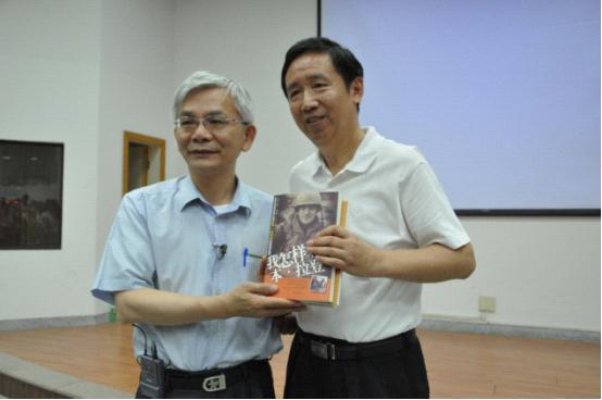 汕头大学长江新闻与传播学院院长范东升(右)赠书予《旺报》社长黄清龙。(黄泽波/摄)