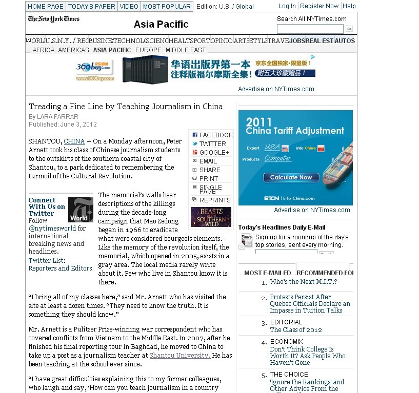 6月3日,《纽约时报》刊登了一篇发自汕头的报道Treading a Fine Line by Teaching Journalism in China(《在中国教新闻的微妙平衡》),关注西方记者进入中国从事新闻教育工作。