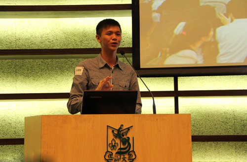 分享会上,实习学生们还别出心裁地策划了猜“港词”的游戏环节,活跃了现场气氛。猜对屏幕上的“港词”的同学就能获得一份小礼物——由香港实习团的学生精心制作的明信片。刚开始时的“新报”、“爆樽”、“断片”等“港词”,都难不倒学生,但随着比赛的进行,难度也逐步加大。当屏幕上出现“嘴藐藐”时,刚刚还沸腾的现场立刻安静了下来,大家都陷入了沉思。这时,主持人提醒到:“这个词的意思能够用一个QQ表情来表示。”“酷?”马上有学生举手起来回答。“不对。”主持人遗憾地摇头。接着又有几个同学尝试着回答,但都没能猜对。大家开始交头接耳地讨论起来。最后终于有一位女生回答了正确答案,原来“嘴藐藐”是指撇嘴,略有轻佻傲慢。