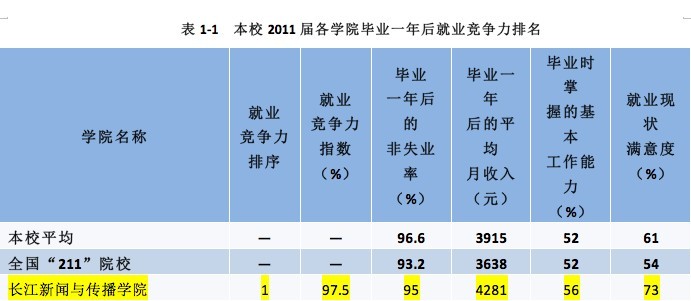 汕头大学委托具有权威性的麦可思调查公司就社会需求和人才培养质量,对汕大各学院毕业生情况进行了全面调查,该公司日前公布调查结果。报告指出,长江新闻与传播学院2011届毕业生就业竞争力综合指数全校排名第一(97.5%)。这项指数是根据毕业一年后的非失业率、平均月收入,毕业时掌握的基本工作能力以及就业现状满意度等四项指标计算得出的,我院上述指标均高于全国211院校的平均水平。我院新闻学专业的就业竞争力指数在本校各专业中排名第二,该专业的上述四项指标亦明显高于全国211院校的平均水平。