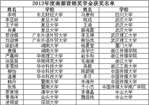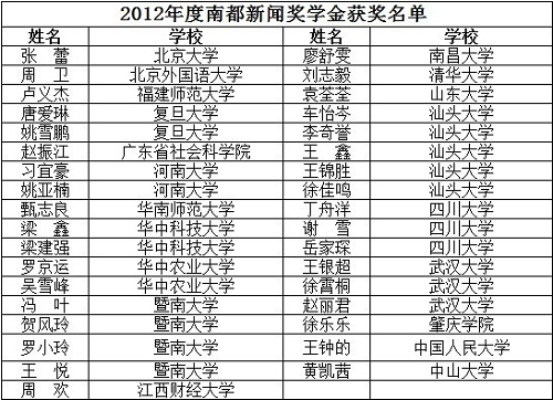 2012年度南都奖学金获奖名单近日出炉,来自国内32所高校的70名学子,从一百多所高校的申报人中脱颖而出,我院车怡岑、李奇誉,王鑫、王锦胜、徐佳鸣同学获得南都新闻奖学金,黄海洋同学获得南都营销奖学金。这是我院历年来获奖人数最多的一届。在此之前,我院居璐同学曾获得2010年度南都新闻奖学金三等奖。