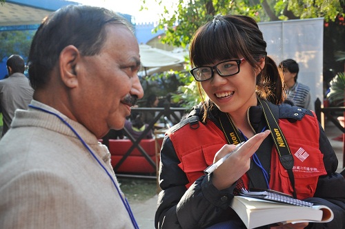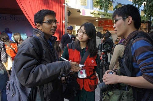 印度报道团由倪青青、白净两位带队老师和雷媛、冯桂梅、黄海洋、杨柳青、曹惠仪、黎子伟六位学生组成。报道团于1月23日出发,24日凌晨时分抵达新德里,24日下午赶到斋普尔后立刻前往文学节现场进行采访报道。在文学节上,报道团成员对美国知名作家Peter Hessler(中文名何伟、曾写作多本与中国有关的畅销书籍)进行了人物专访,并采访了获得多个国际文学奖的华裔女作家李翊云。
