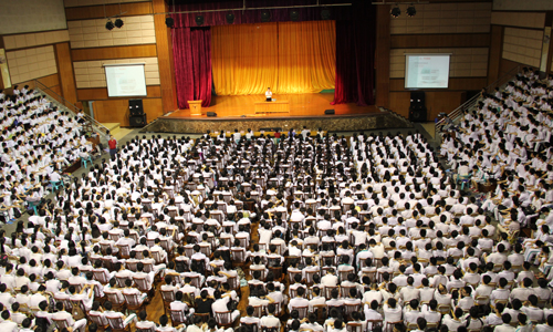 上千名潮阳实验中学学生在该学校大礼堂参加此次活动。(李秋悦/摄)