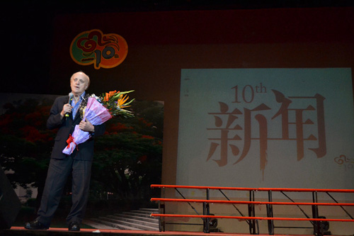 既然是院庆盛事,晚会节目除了感怀离别,当然还寄托着对新闻学院的深深祝福。12级的施海燕、欧阳志成、冼伟腾等五位学生合演的小品以幽默搞笑的台词博得观众喝彩。小品以时间为序,以小见大反映新闻学院学生从毕业到从业再到回校参加院庆的心路历程。学生们卖力表演,老师们也用自己的方式表达对学院的祝福。白净老师和倪青青老师在一曲热辣的印度舞后向观众播放视频。这段视频拍摄于印度,数十位来自世界各地、身份各异的人通过视频向新闻学院表达祝贺。继播放视频之后,倪老师表达对即将退休的两位来自美国教授Peter Arnett 和 Peter herford 的敬意。两位Peter中的Peter Arnett教授上台演讲,诉说自己来到汕头大学后的历程和感想。过程中台下观众高呼“Peter! Peter!……”表达对教授的热爱,更有学生上台献花,教授感动得热泪盈眶,一边哽咽一边清唱了一首歌,表达对学生们的感激。