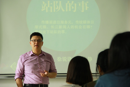 课室外贴着海报,上面写着:“不做记者,还能干点啥?理想很丰满,现实很残酷。学新闻不做记者,还能干点啥?说点现实的吧,或许有你想要的答案。”课室内坐满同学,徐锐锋问了一道问题:“你们有谁在未来要当记者?”,仅数人举手,徐锐锋立即说:“你们今天来对了!”