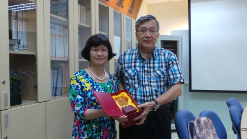 陈岳芬老师(左)代表汕大新闻学院赠礼予文大新传学院院长叶明德,盼双方续多合作交流。