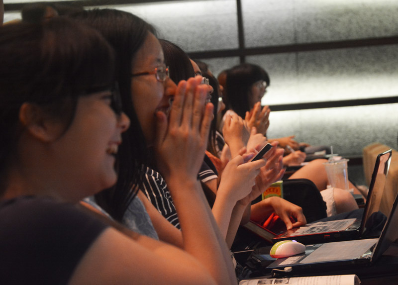 分享会开场设计别开生面,报道团学生在一片昏暗中进入演讲厅,错落有致地围成一圈。突然,学生们同时打开手电筒开关,齐刷刷指向圆圈中间。 “聚光灯”下,带队老师倪青青与John Noonan摆出《纸牌屋》的人物造型,闪亮出场。精心准备的出场方式赢得观众们的掌声。