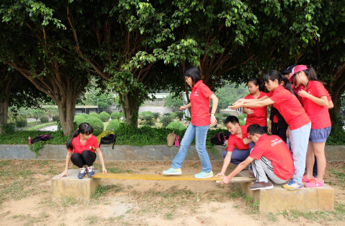 上午9时左右,我院师生乘车到达山清水秀的揭阳市素质拓展中心,同学们在4名教官的组织下以班级为单位分为4个中队,每个中队配置一名教官,接下来每个中队的同学为自己的中队想了队名、口号和队旗,最后各中队进行了五项户外拓展活动,分别是孤岛求生、生日线、攀岩、竹排竞技和盲人过桥。