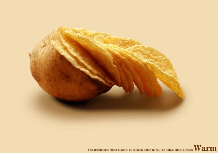 涂志初认为,设计源于生活,取材于生活。一个土豆在高温下变成薯片,动物觉得热了就会伸出舌头,这都是生活常识。而高温与热都是全球暖化的直接体现。把土豆和薯片放在一起,拍张照片,便可表达出土豆在高温下被炸成了薯片的意思;在纸上画动物,然后抠出舌头形状,就如同动物热得吐出了舌头一般。