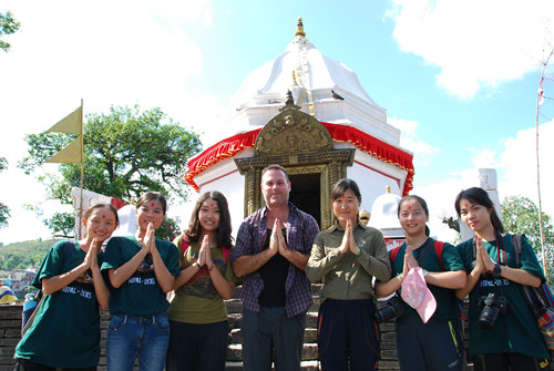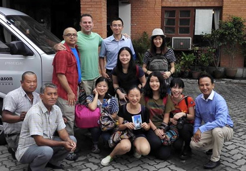 报道团与曾与汕大任教的Binod(后左一)、中新社泰国分社社长符永康(后左三)及尼泊尔当地大学教师Pankaj(右前一)合照