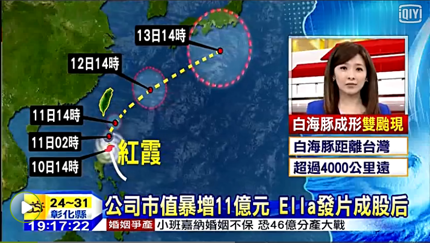 一有重要的事件,比如台风袭击,就常有这样的画面出现。但其实主播播报的是另一条新闻,蓝色字幕条显示的内容才是主播正在播报的新闻。主播头像下方的CG字幕条均是有关台风的消息,协助观众理解画面图片。同时,画面图片往往是动态的,会清楚显示整个台风近期的动向,每一天都进行更新。