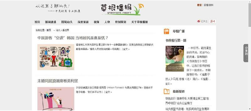草根播报是汕大长江新闻与传播学院联手汕头特区报社《大华网》创办的新闻媒体。采编团队由汕大学生组成,关注汕头民生和校园动态,以“平民化视角、多媒体展示、互动性传播”为特色传递新鲜有价值的资讯。