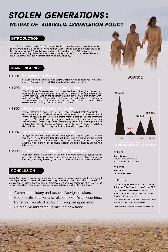 10月22-24日,刘紫瑜代表我院澳大利亚研究中心参加了全国高校以澳大利亚历史与文化为主题广告比赛,其作品《《被偷走的一代》反映了澳大利亚土著青少年在“白澳政策”下的悲惨经历,在参选的近百件作品中荣获三等奖。评委会认为,该作品“敢于创新,重现了一段被忘却的历史”。