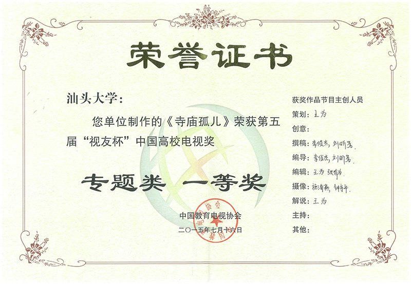 《寺庙孤儿》是大三学生张有为、李俊杰、钟宇平、王为、刘昕茗和施海燕在2015年春季学期选修《专题片制作》课程的作业,由黄义忠老师指导,并在刘立坚老师指导的汕大电视台播出。该片以潮汕寺庙收养孤儿的故事为切入点,深入探讨了该现象形成的历史背景,报道了国家福利政策和当地福利机构实际情况,由此希望引起公众对此社会现象的关注。