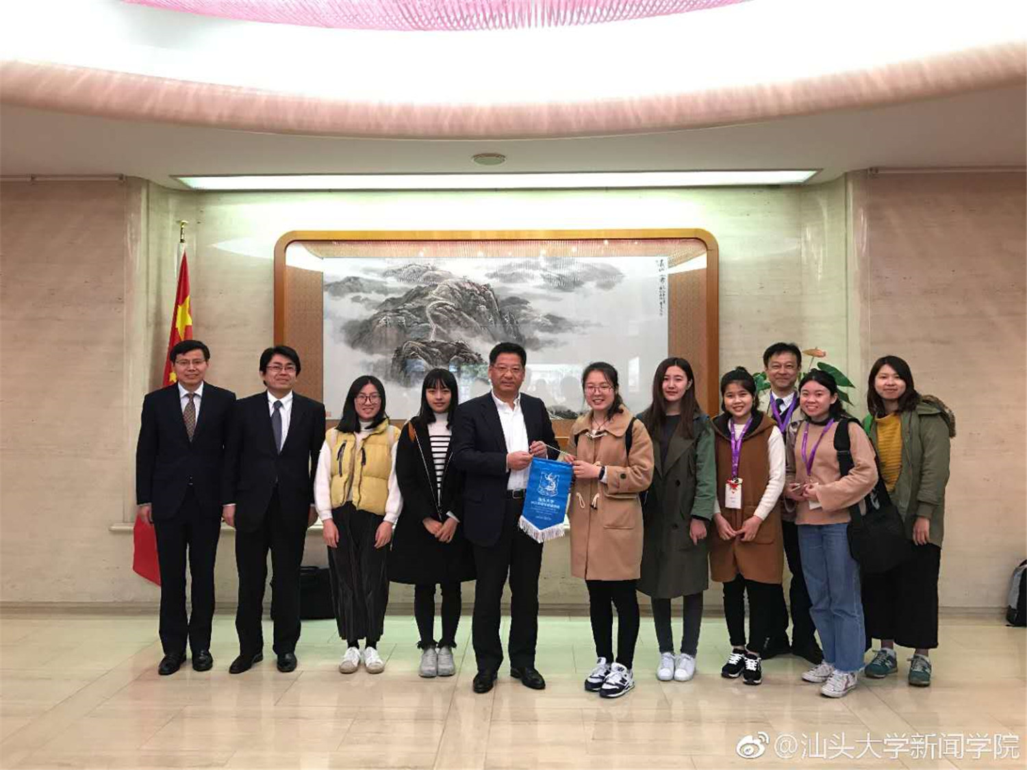 在采访期间的4月1日,汕头大学新闻学院访日团得到了中国驻福冈总领事何振良的会见。何总领事肯定了同学们的访问成果,同时寄予厚望,希望同学们继续努力深造,将来成为优秀的媒体人,推动中日两国民众客观地认识、理解对方。同学们也表示,本次采访之行对日本有了进一步的了解,收获颇丰。