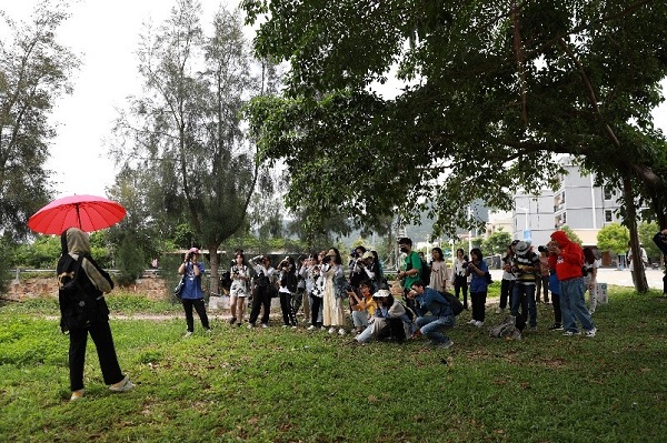 在一片绿意盎然的小树林里,身着红色上衣的凌学敏老师向一位学生借到了一把红伞,即兴给同学们上起课来。凌学敏老师从学生中选择了两位当模特,一边指导她们摆动作、调整神情动作,一边指导其他同学从不同角度练习抓拍。