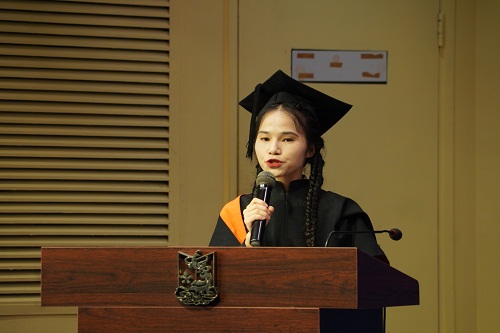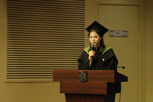 蔡秋彦副教授作为教师代表上台,与大家分享了这四年里她对同学们成长的见证和感悟。毕业之际,她叮嘱同学们,在充满焦虑与忐忑的生活中,要保持理性的态度与道德的勇气。“既要学会在黑夜中逆风而行,也要懂得在沸腾处保持清醒。但愿我们能够脚踏实地,仰望星空。”她与毕业生们共勉。