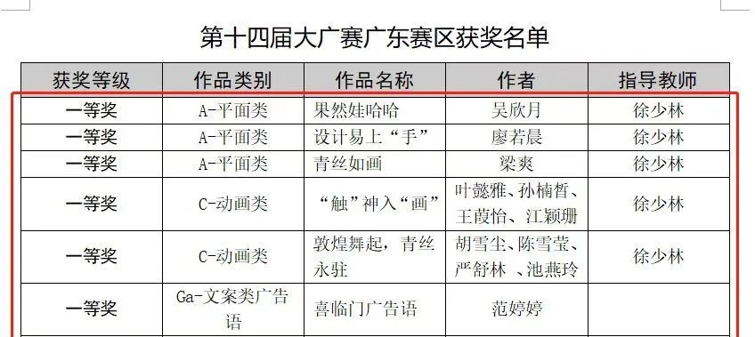 9月6日,第14届全国大学生广告艺术大赛公布全国总评审获奖名单。汕头大学长江新闻与传播学院师生在本次大赛中表现优异,作品获国家级优秀奖1件,省级一等奖6件、二等奖2件、三等奖7件。