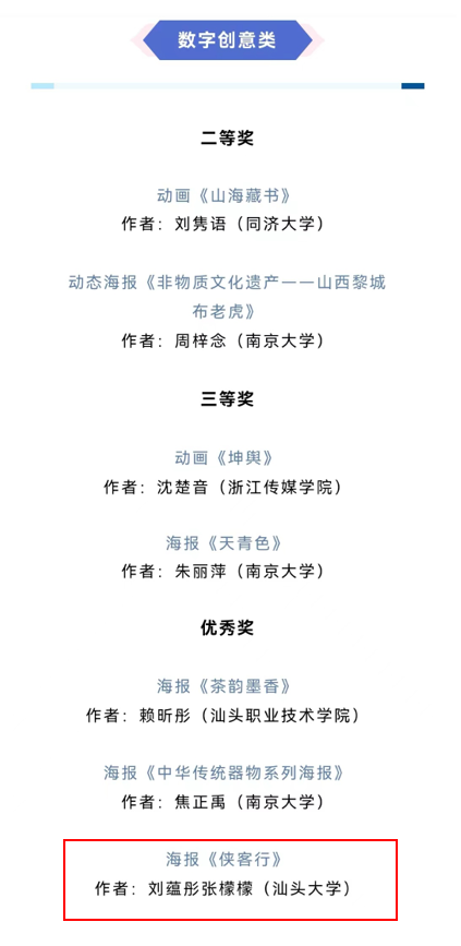 我院2020级国际新闻与传播专业王蕊、2019级网络与新媒体专业李仪、2019级新闻学专业江怡雯创作的《一个空盒,让我瞬间破防》与2020级广告学专业刘蕴彤、张檬檬创作的《侠客行》海报分别荣获校园报道优秀奖与数字创意类优秀奖。