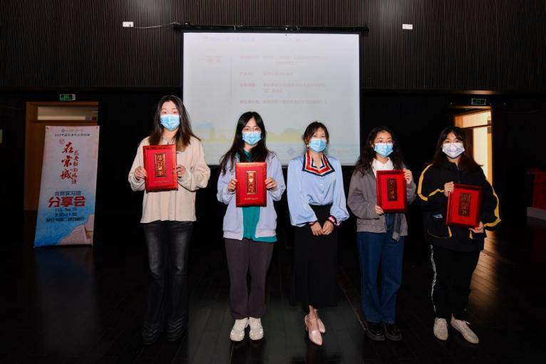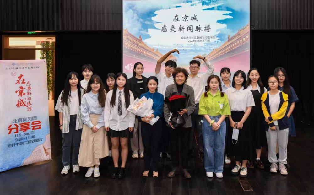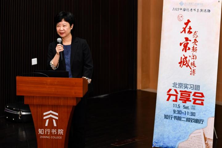同日上午,2022年北京实习团成员在知行书院二楼戏剧厅以“在京城感受新闻脉搏”为主题,分享了他们77天在北京的实习生活。今年7月至9月,由新闻学院张征老师与蔡秋彦老师带队,15名新闻学子分赴新京报、中国妇女报、健康报、未来网、中国市场监管报、北京青年报等6家媒体实习。他们在各自岗位上经历成长之痛,体会成长之悟,并收获成长之喜。