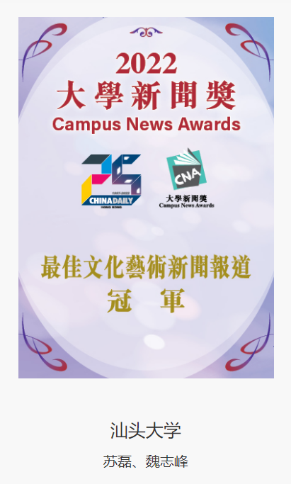 12月8日,由中国日报举办的“2022年大学新闻奖颁奖典礼”在香港举行。汕头大学长江新闻与传播学院2020级新闻学专业学生苏磊和网络与新媒体专业学生魏志峰获“最佳文化艺术新闻报道”冠军。