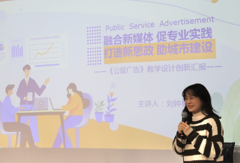 刘钟惠老师分享了《公益广告》教学设计创新案例,提出“融合新媒体促专业实践,打造新思政助城市建设”的教学思路,结合专业教学与汕头市消防救援支队开展合作,取得了良好的教学成效。