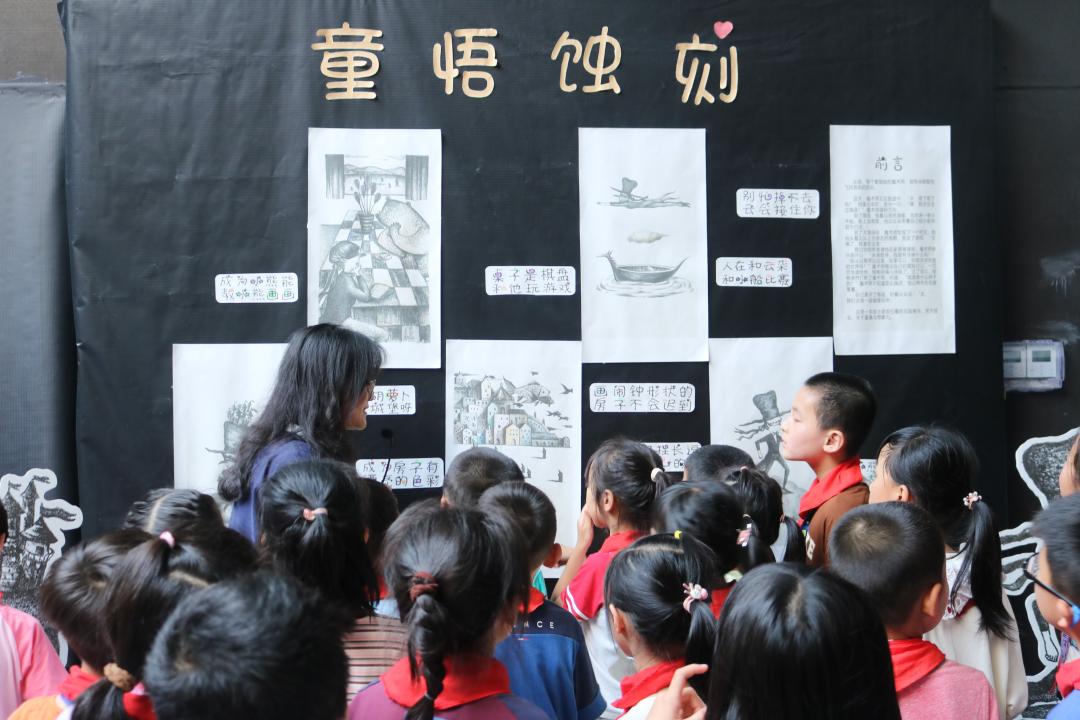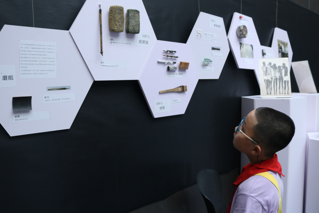 “小朋友们才一二年级,原先以为他们不太能理解。但真正面对他们时才发现,他们对版画作品有自己天马行空的理解。小朋友们能发挥想象力,给黑白的版画增添五彩斑斓的色彩。”负责讲解“童悟蚀刻”板块的李碧莹颇有感悟。从最初对版画的陌生,到了解版画制作的五大步骤,能够带领小朋友们接触和认识版画,对于策展的同学来说是一次特别的回忆。