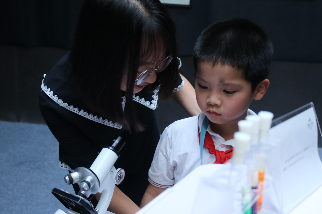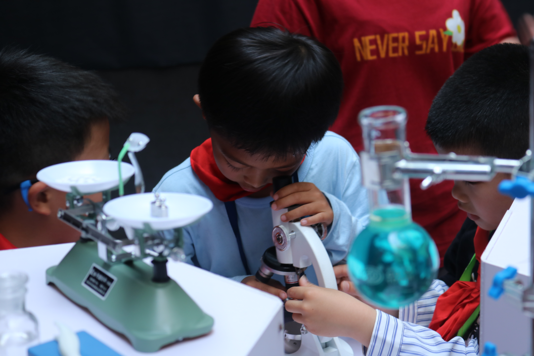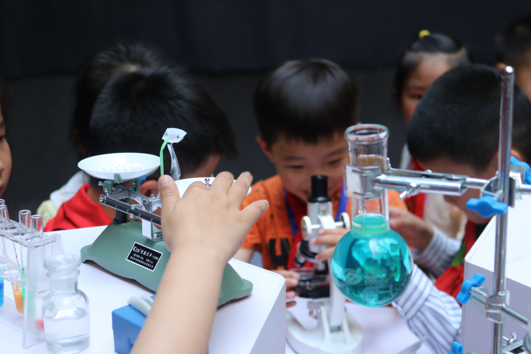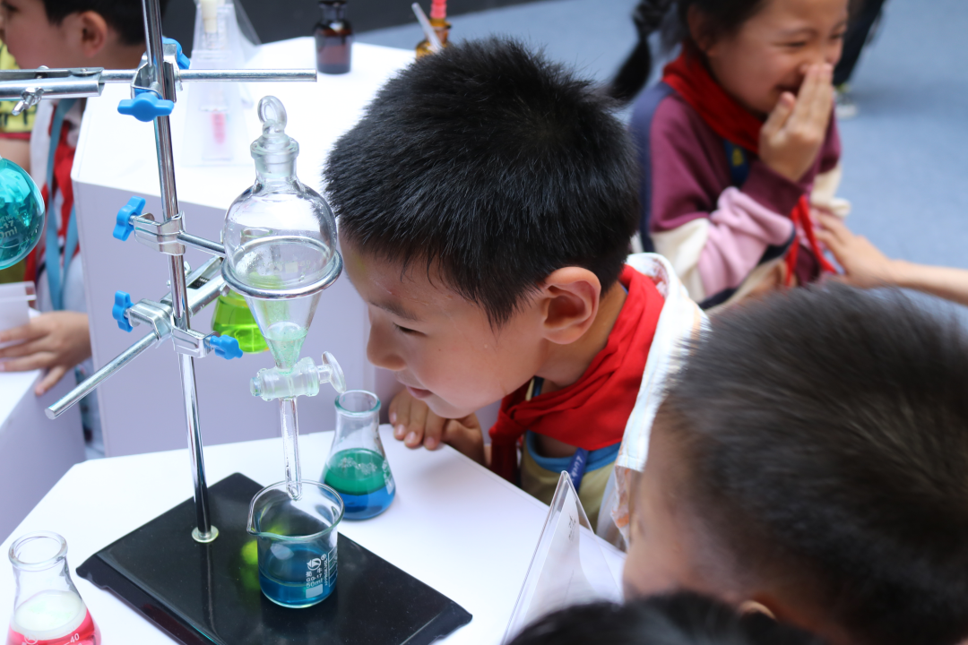 每到一处,小朋友们都很是兴奋和好奇。在不同的化学材料和实验器材面前,聚集了最多小朋友。他们好奇不同颜色的液体都有何用途,好奇为何上面都有一层油,还好奇这些东西有没有毒。“老师,我可以拿一瓶走吗?”参观结束时,一位小朋友恋恋不舍地说。