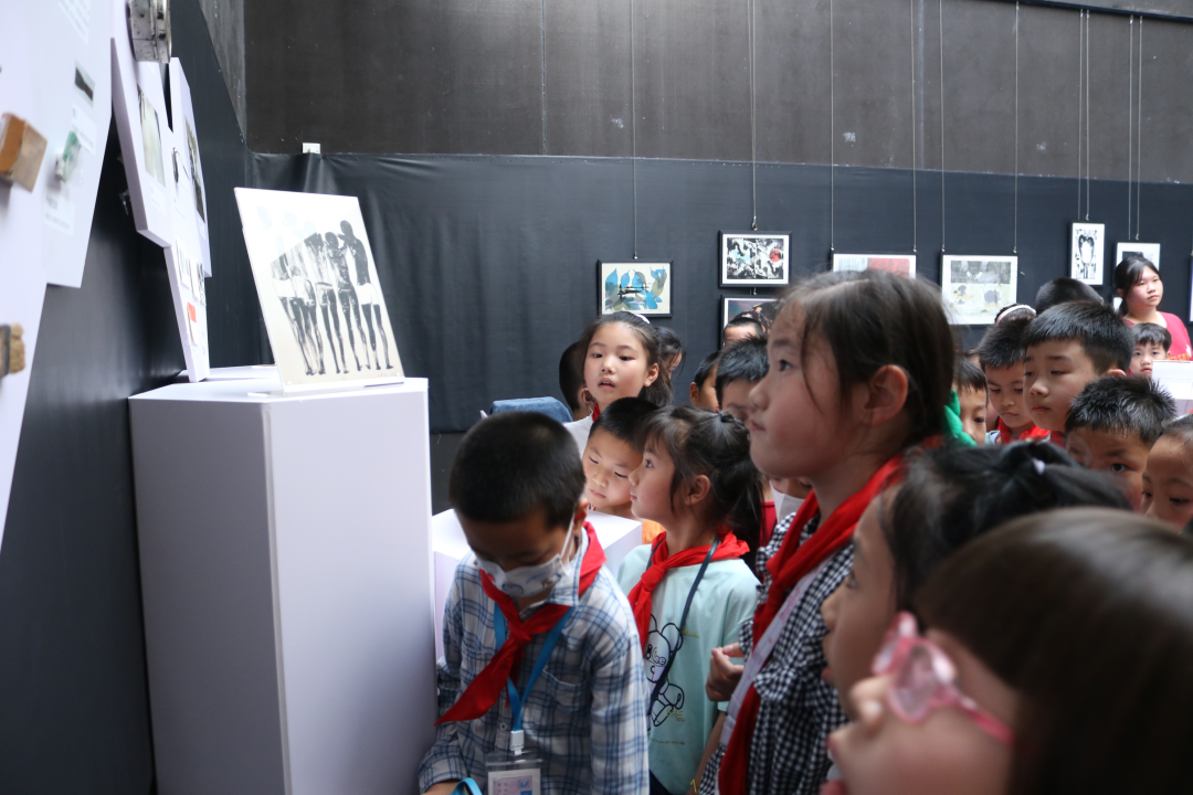 4月18日下午,新闻学院参与艺术展策展工作的同学带领汕头大学附属小学77名小朋友一同参观《蚀与客》艺术展,并围绕不同的版画主题内容向小朋友讲解。
