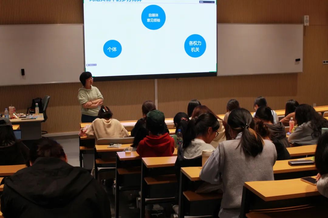 “4·14聊城于欢案”曾在网络空间中引起广泛关注和讨论。李婉琦老师以电视剧《底线》中的改编案件为切入口,梳理了“于欢案”的始末,并向同学们讲解了网络舆论与舆论监督之间的关系。