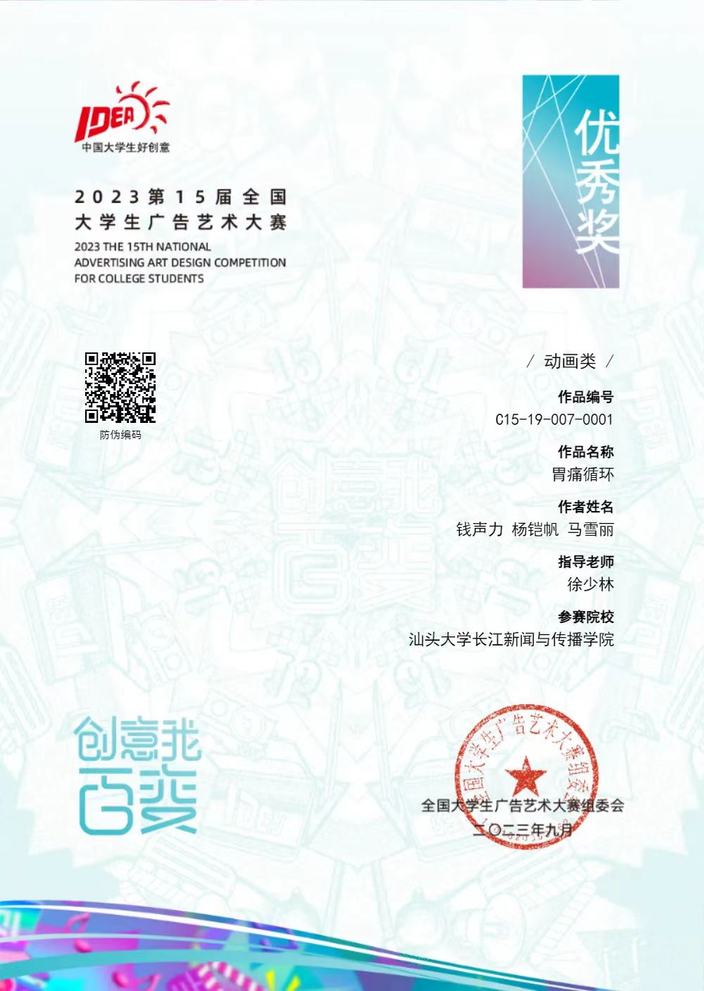 近日,第十五届全国大学生广告艺术大赛公布全国总评审获奖名单。汕头大学长江新闻与传播学院2021级网络与新媒体专业钱声力、杨铠帆、马雪丽创作的《胃痛循环》在本次大赛中获动画类国家级优秀奖,徐少林老师作指导。
