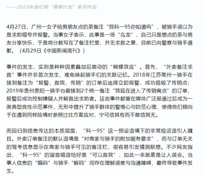 时事评论作品《善意举动无需制造对立》,首发于红网“红辣椒评论”新闻专栏,获破万阅读量,同时被腾讯等多家网媒转载,产生了良好的社会效应。评论以“顾客点外卖备注科一95,骑手报警”这一热点新闻事件为引,解读“外卖备注”这一生活细节在当下发挥的提示与求助意义,分析当事骑手阅读备注后的心理动机,梳理事件全局逻辑链,以挖掘事件背后折射出的与人为善、助人为乐的向上人生观。