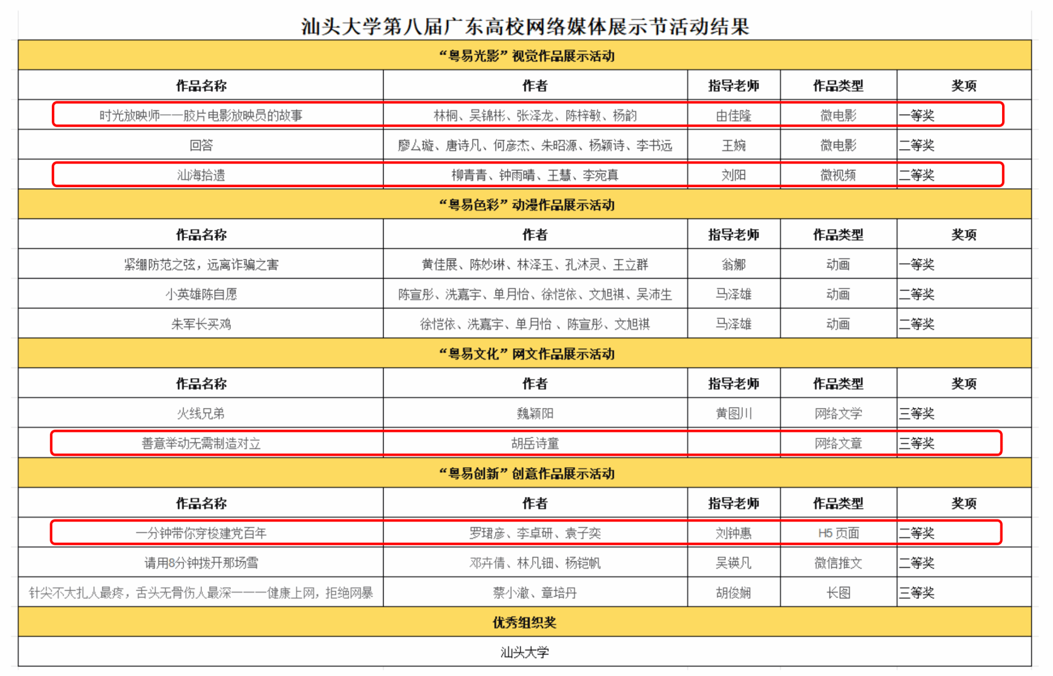 近日,第八届广东高校网络媒体展示节活动获奖名单正式公布,我院师生斩获佳绩。其中,由2020级网络与新媒体专业林桐、吴锦彬、杨韵,2021级新闻学张泽龙、陈梓敏等创作的微电影作品《时光放映师——胶片电影放映员的故事》获“粤易光影”视觉作品展示活动一等奖;由2022级研究生柳青青、钟雨晴、王慧、李宛真等创作,刘阳老师指导的微视频作品《汕海拾遗》获“粤易光影”视觉作品展示活动二等奖;由2021级广告学罗珺彦、2022级环境设计李卓妍、2023级国际新闻与传播袁子奕等创作,刘钟惠老师指导的H5页面作品《一分钟带你穿梭建党百年》获“粤易创新”创意作品展示活动二等奖;2023级研究生胡岳诗童的网络文章作品《善意举动无需制造对立》获“粤易文化”网文作品展示活动三等奖。