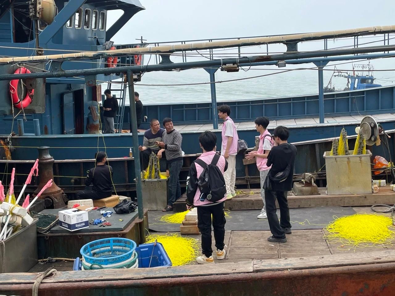 同学们在渔船上和渔民交流