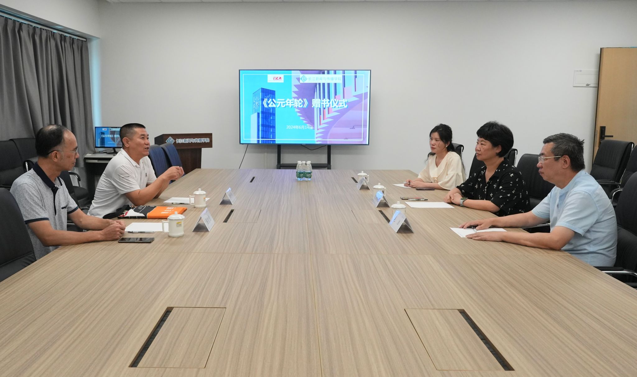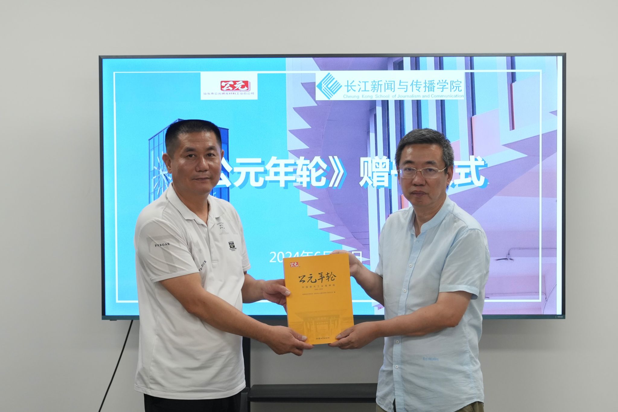 谢伟明代表公元厂赠予长江新闻与学院《公元年轮》书籍,毛浩代表学院接受赠书。