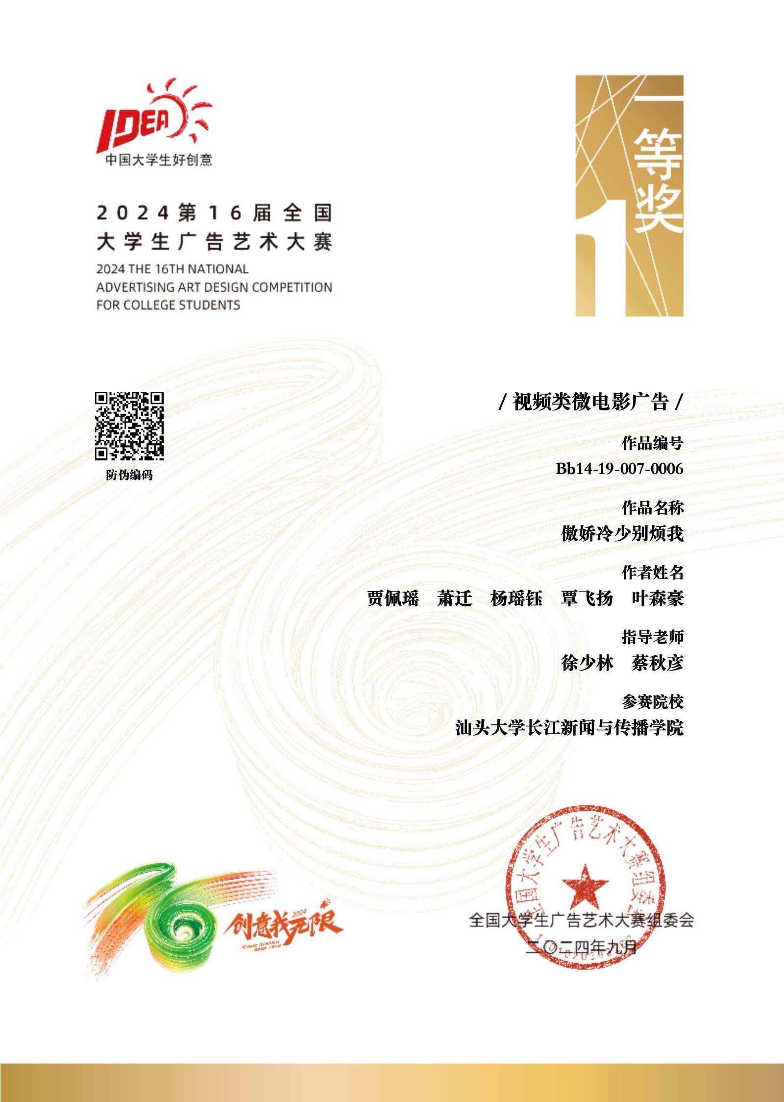 由徐少林副教授和蔡秋彦副教授共同指导的视频类微电影广告作品《傲娇冷少别烦我》荣获全国一等奖。获奖团队中,有三名学生是新闻学院2022级网络与新媒体专业学生——贾佩瑶、萧迁、杨瑶钰。
