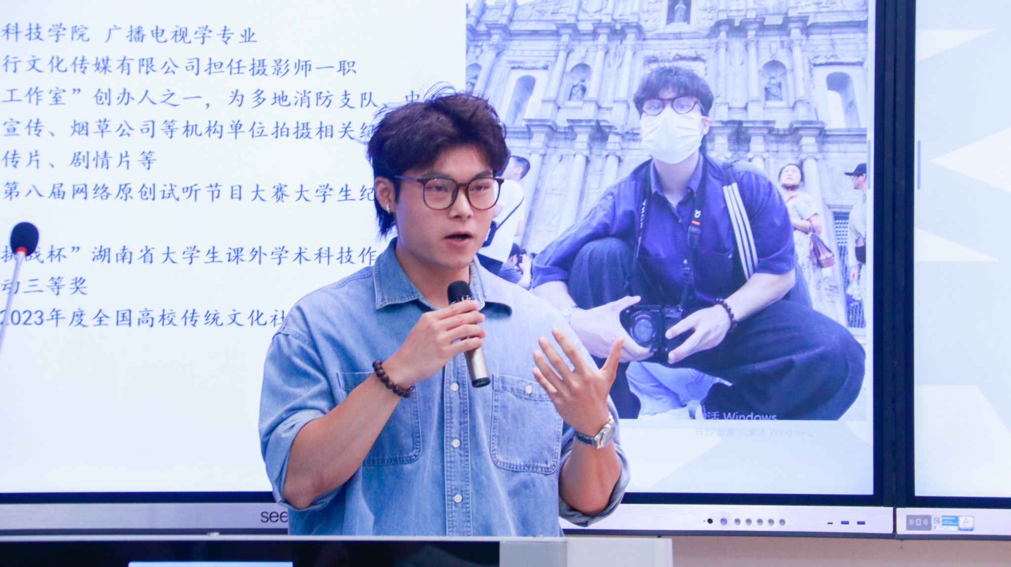 聂建廷重点分享了“作为一名社会研究者,我们应当是什么样的?”。他曾在湖南省永州市创办影视工作室,为当地的消防支队、中心医院、学校等单位拍摄相关宣传片、专题片、纪录片。曾获得第十五届“挑战杯”湖南省大学生课外学术科技作品竞赛红色专项活动三等奖等奖项。他认为,学习“新闻学”学的是一种思维模式,一种情感共鸣的能力和敢说真话的情怀担当,新闻并非“无学”,“它可以成为你实现个人价值的途径之一”。