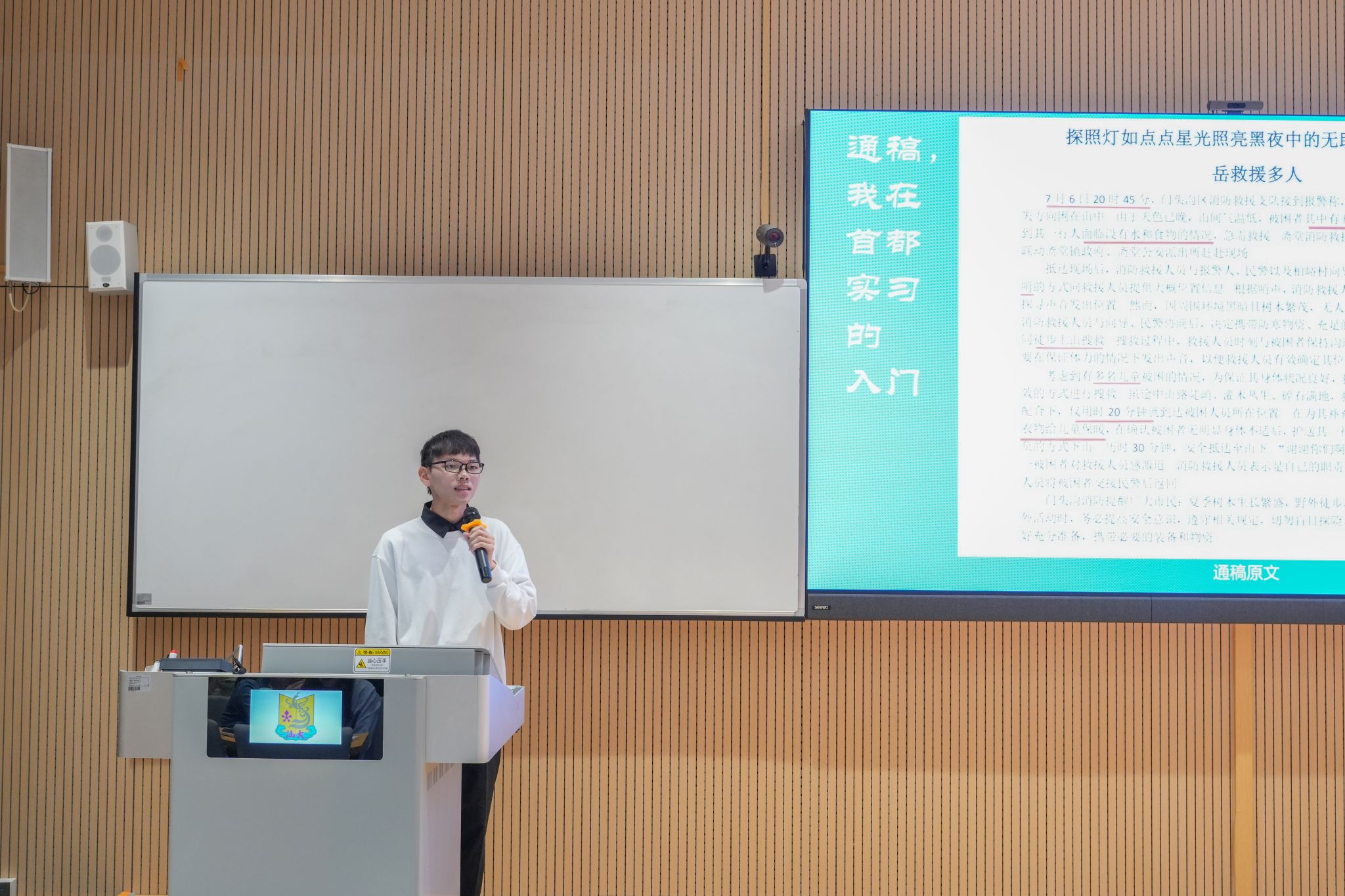 对于一篇好的新闻,“笔力”也是不可忽视的一部分。2022级国际新闻与传播专业的戴越认为,在采访过程中,要主动思考、主动行动,注重细节、核实信息、数据清晰,力求让读者从报道中了解到事实真相。同时,她也强调了语言简练准确且生动、提升组稿能力的重要性。2022级新闻学专业的陈洁鑫用一篇关于救援的报道,分享了他在实习期间修改通稿的经验,陈洁鑫说:“要认真对待通稿,并且心中要牢记,记者是要给读者写稿”。