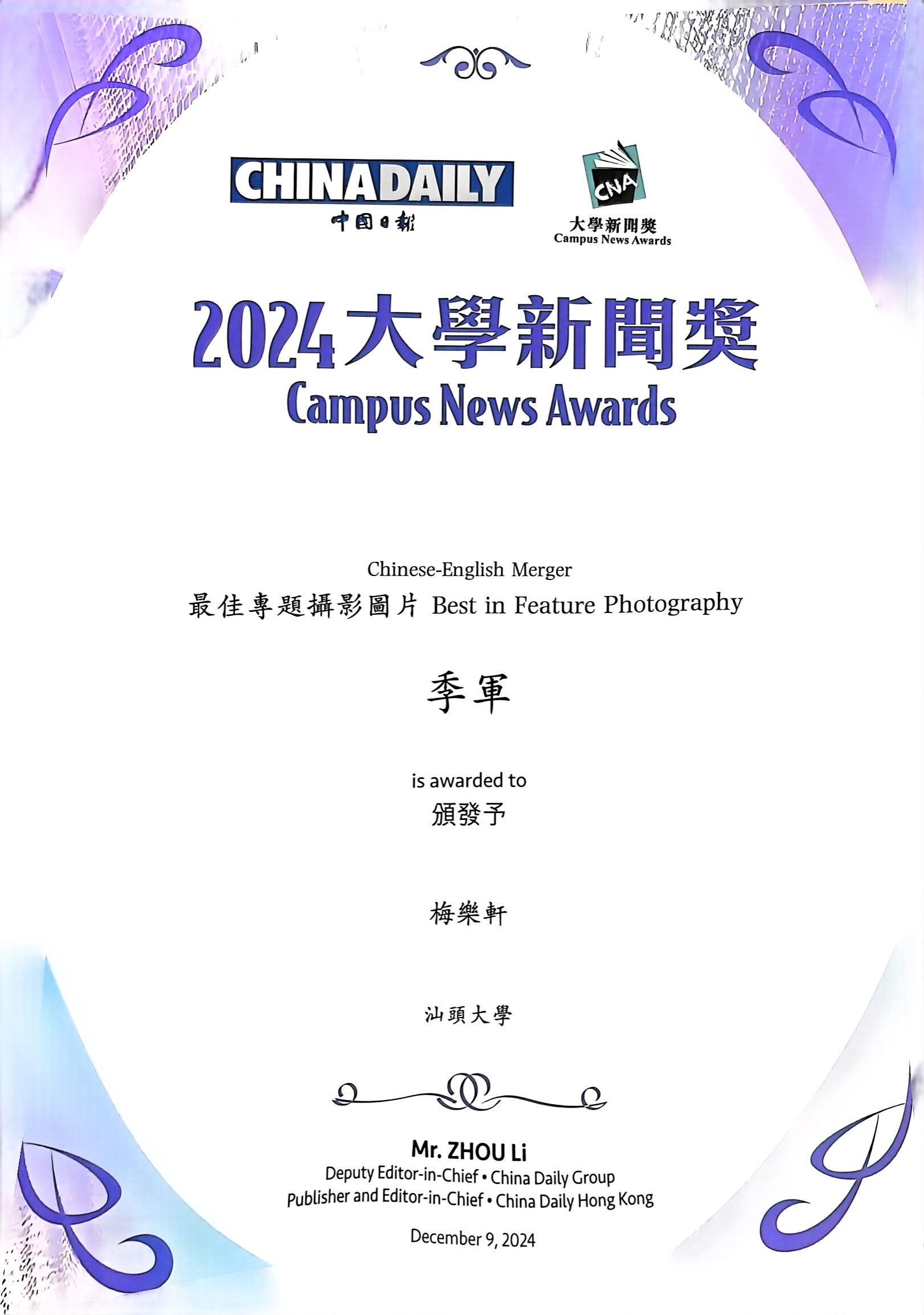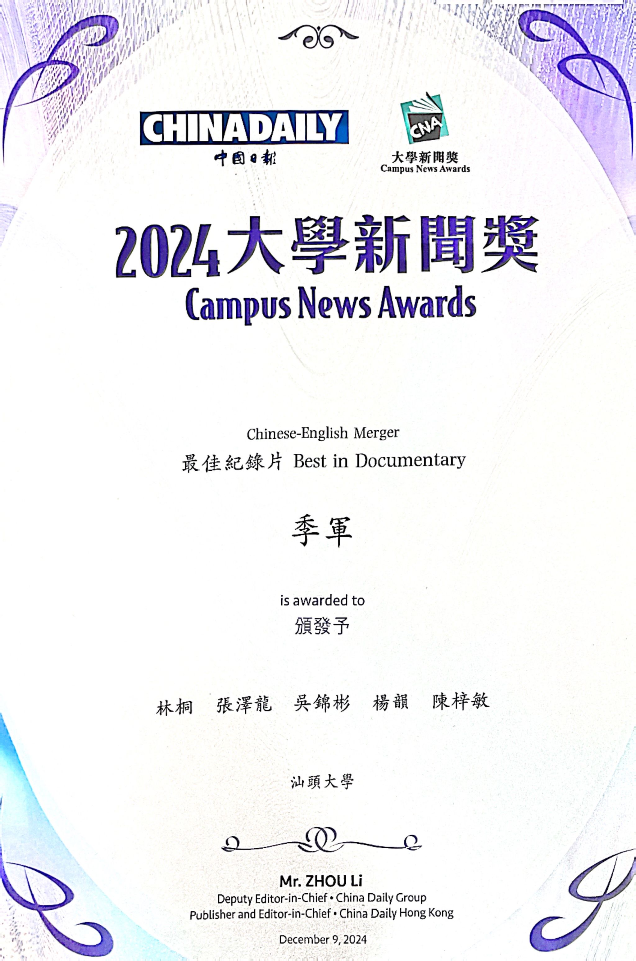近日,由中国日报举办的“2024大学新闻奖”颁奖典礼在北京师范大学-香港浸会大学联合国际学院(珠海)举行,长江新闻与传播学院两部学生作品分别获得最佳纪录片、最佳专题摄影图片等两个奖项季军。