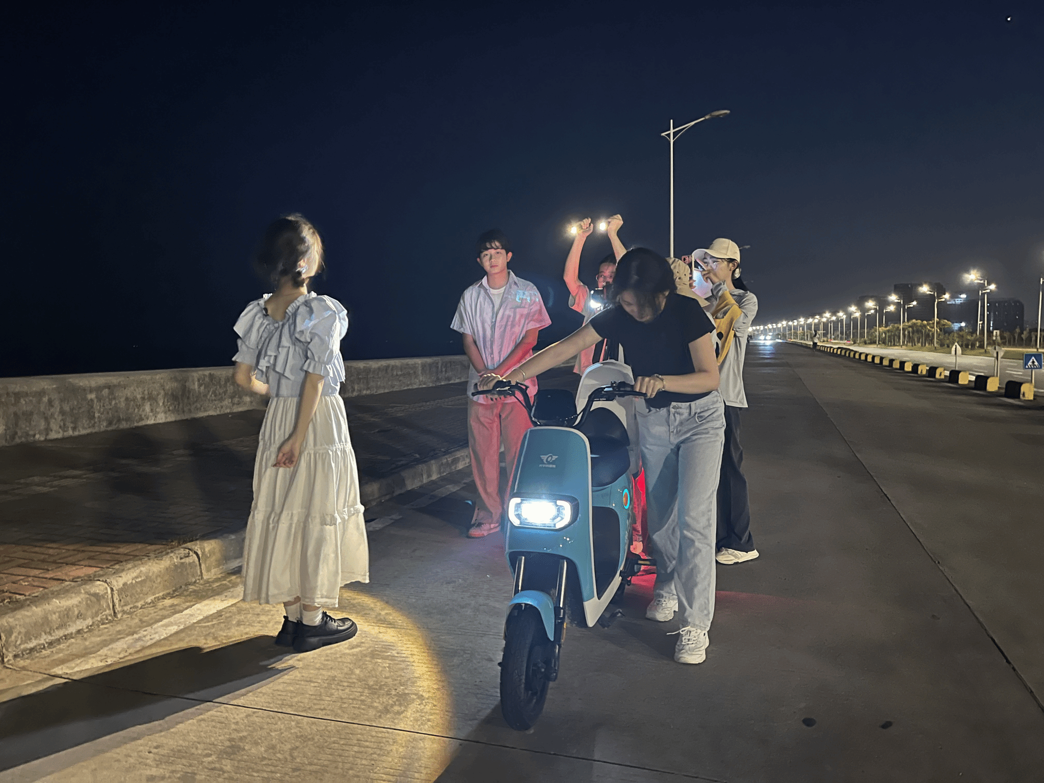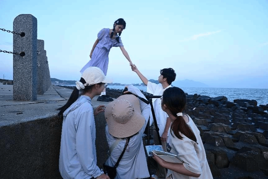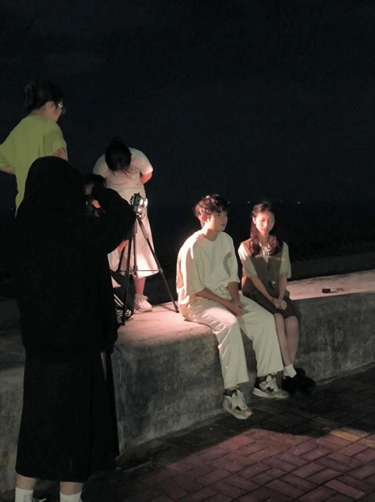 因我们都是第一次拍摄微短剧,在协调时间、人员分工、经费管理上都缺乏经验,在拍摄制作中,我们真实体验到了剧组工作的不易。最难的是自然条件的制约,由于我们的主题是“蓝调时刻”,很多场戏都在海边拍摄,但由于蓝调时刻十分短暂,等到演员、摄像全部就位,天色已经黑了。海边天气多变,起雾刮风都是平常,所以取景、造型和收音总是被影响。王云鹏老师告诉我们“在面对不可控因素时灵活变通,是每一个剧组的必修课。”