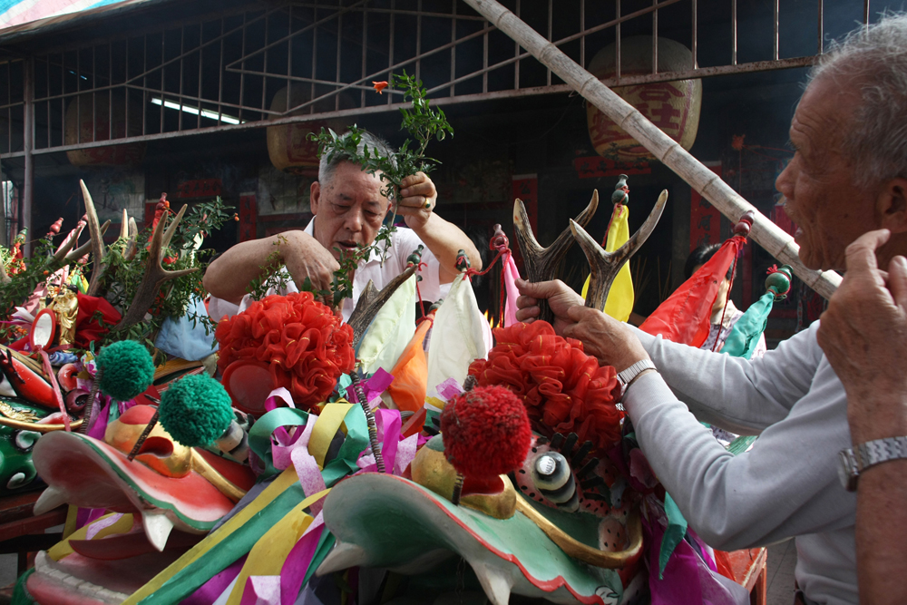 桥头村正为一年一度的端午节准备两只新的龙舟,这是其中一个龙头。做一条龙舟要将近要花7千元,其中龙头就要花去3千。桥头村在2008年被人偷走了6个龙头,最终村子花钱重新做了龙头,才使这赛龙舟的习俗延续下去。