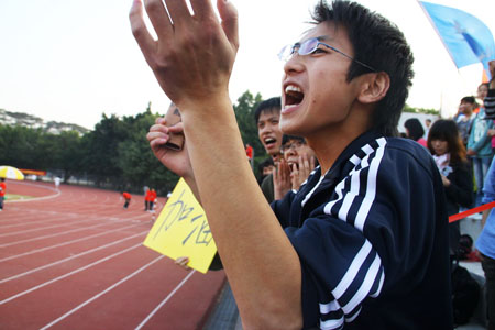 新闻学院拉拉队情绪高涨,“给力”加油 (邹怡 摄)